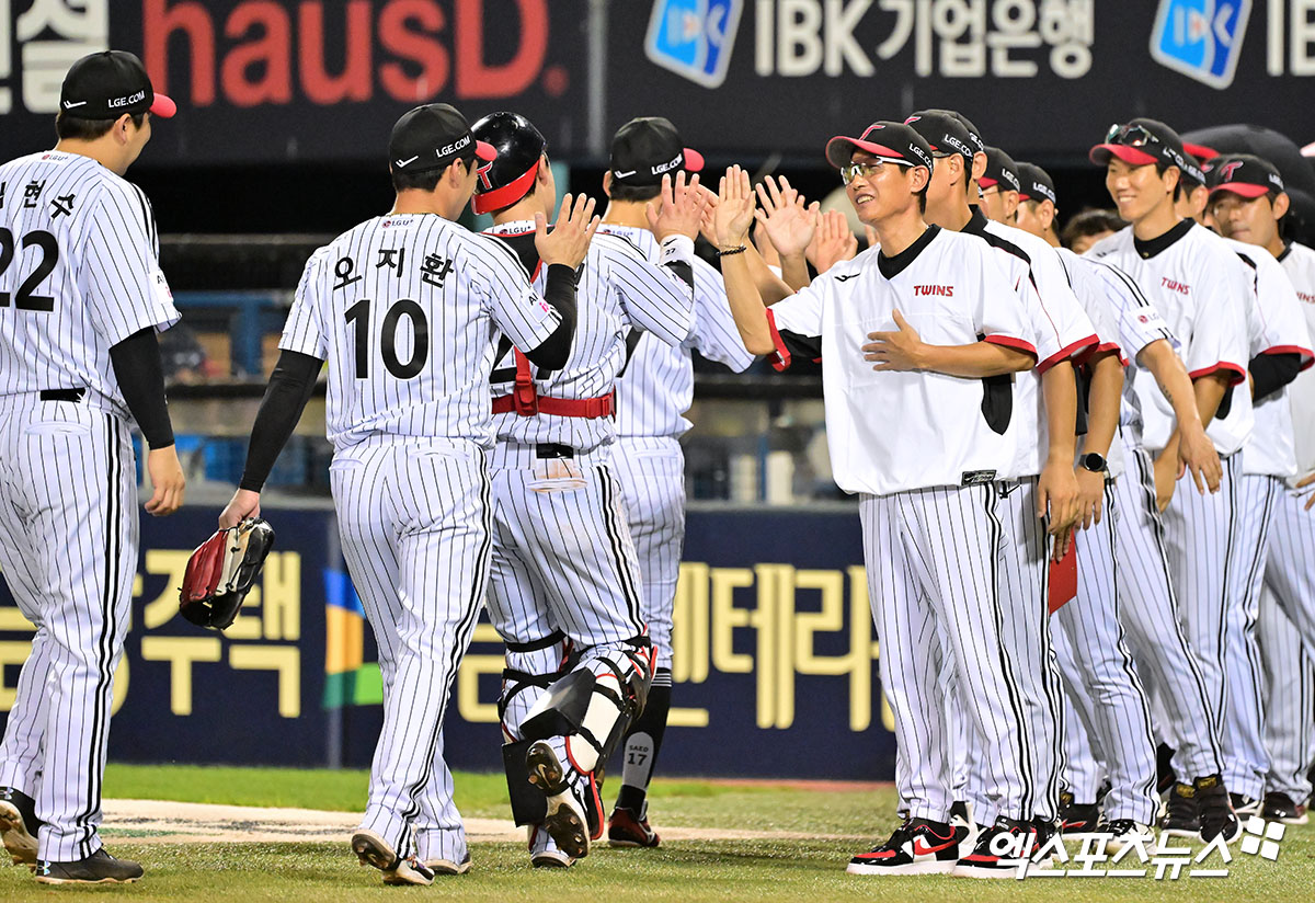 이날 경기에서 승리한 LG 염경엽 감독이 선수들과 하이파이브를 하고 있다.