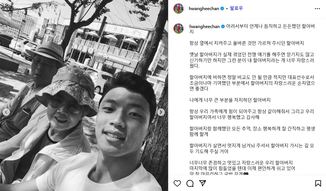 황희찬은 경기 전 자신의 사회관계망서비스(SNS)를 통해 "어려서부터 언제나 든든하고 올바른 것만 가르쳐주신 할아버지, 전쟁 이야기를 해주실 때면 믿기지 않을 만큼 놀랍고 자랑스러웠다"며 "대표선수로서 조금이나마 기여한 부분이 있다면 할아버지의 자랑스러운 손자였기를 바란다"는 글을 남겼다.