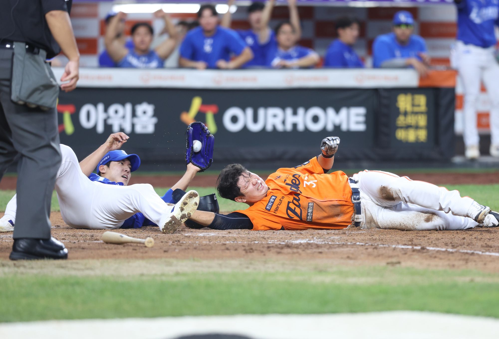 이때 홈 커버를 들어간 원태인이 김인환을 태그아웃시키며 실점을 막았으나, 주자와의 충돌로 인해 한동안 그라운드에서 일어나지 못했다.