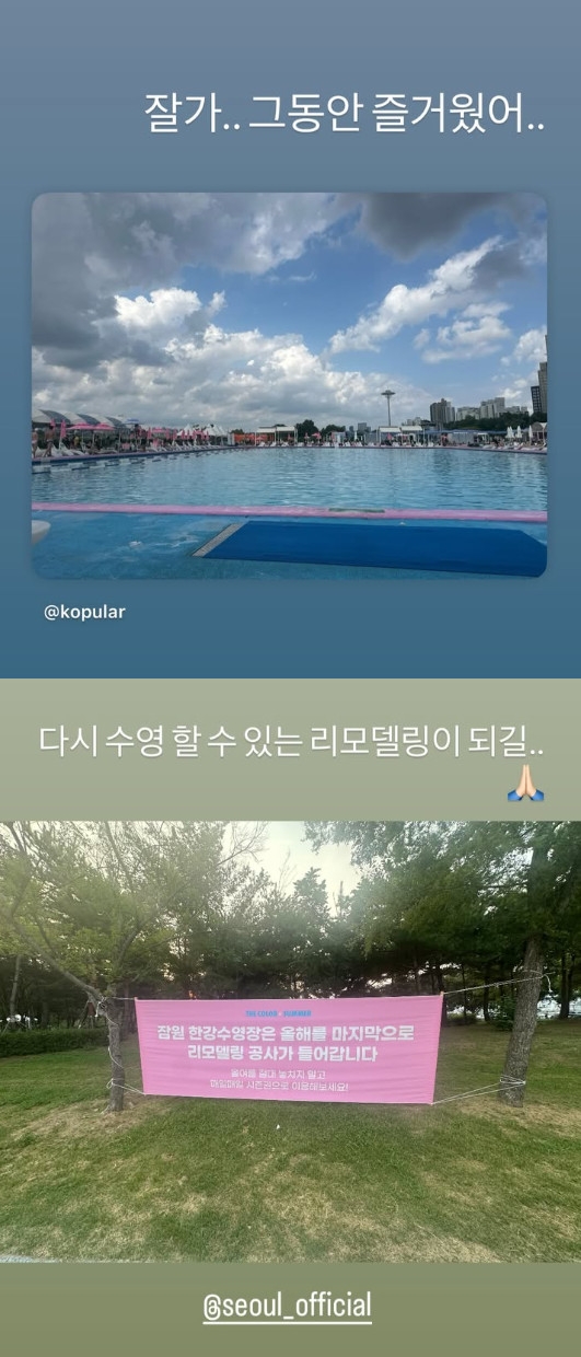 이어 "사실이 아니길 간절히 바라지만.. 슬프네요.. 마음 같아선 이유라도 알고 싶은데"라며 아쉬운 마음을 표한 그는 "그동안 수영장에서 소소하고 행복한 추억이 많아서 글이 길어졌습니다. 바람이 있다면 내년에도 앞으로도 잠원한강 수영장 만큼은 유지되어 이어졌으면 합니다"라고 소망을 드러냈다.