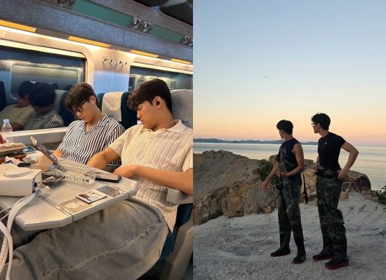 사진 속 탁수 준수 형제는 바닷가에서 촬영을 준비하는 모습부터 장난스럽게 포즈를 취하는 장면, 기차 안에서 나란히 잠든 모습까지 훈훈한 비주얼로 시선을 사로잡았다.