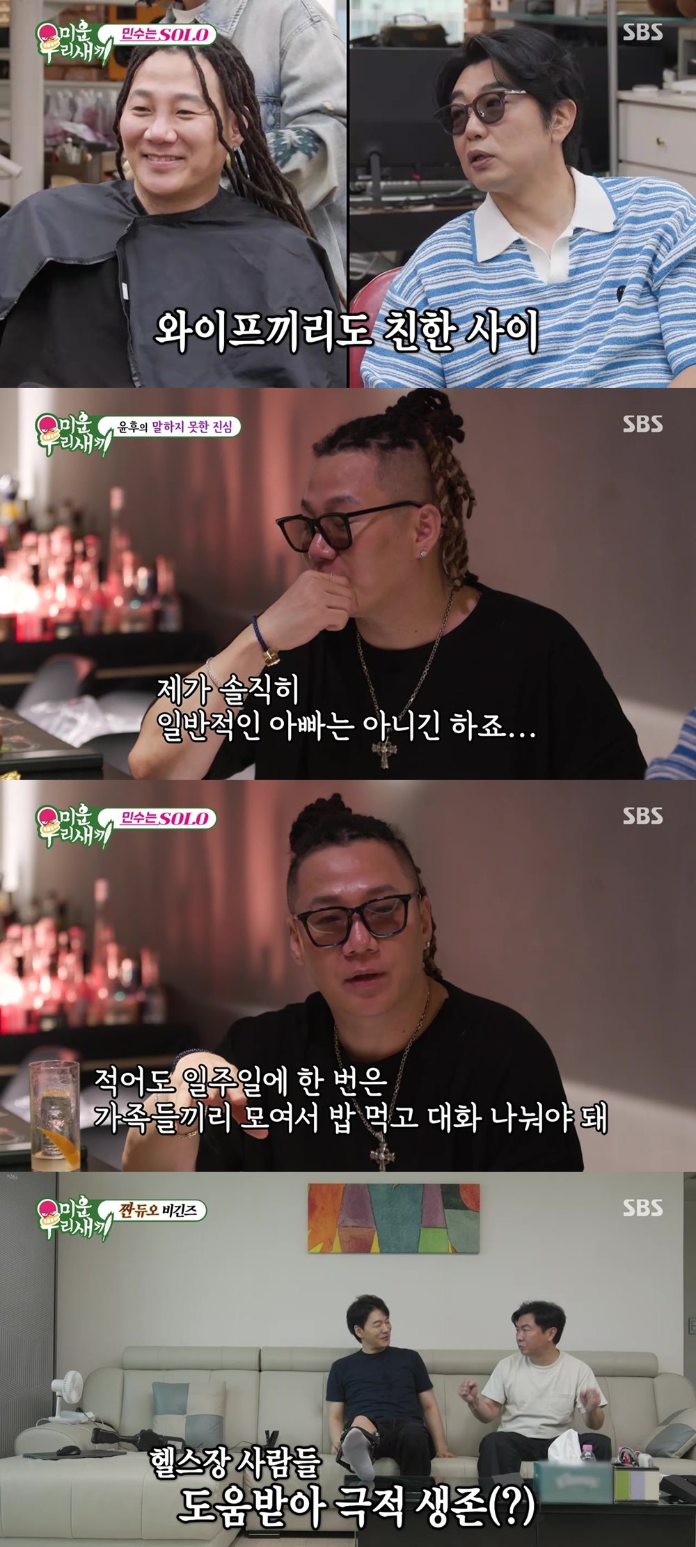 윤민수는 “내가 일반적인 아빠는 아니다. 친구처럼 지내는 관계이긴 한데 내가 조금 지나쳤다고 생각할 수 있다. 후가 속이 깊다”며 아들의 성숙한 면모에 고마움을 전했다. 이어 윤민수는 “적어도 일주일에 한 번은 가족들끼리 모여서 밥 먹고 대화 나눠야한다. 근데 나는 그걸 못한 게 후회스러운 게 많다”며 “그런 것만 했었어도 이렇게까지 되지 않았겠지라는 생각을 한다” 밝혔다.