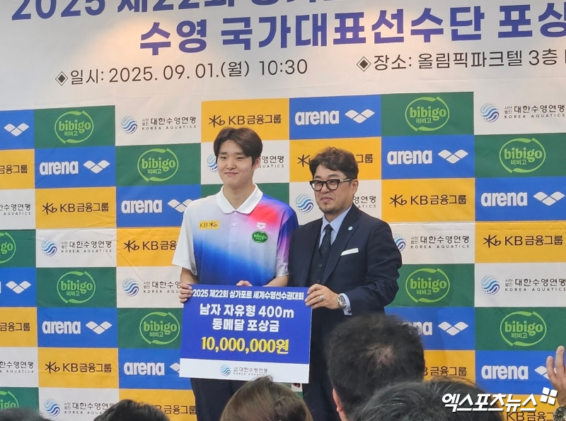 연맹으로부터 포상금 1000만원을 받은 김우민은 "대회 준비하면서 도와주신 연맹 관계자분들, 코치님들께 감사드린다"며 "(포상금 전달식과 같은) 좋은 자리를 마련해 주시는 것 같아서 감사하게 생각한다. 많은 동기부여 된 것 같고, 정말 기쁜 마음으로 수영을 하고 있다"고 소감을 밝혔다.