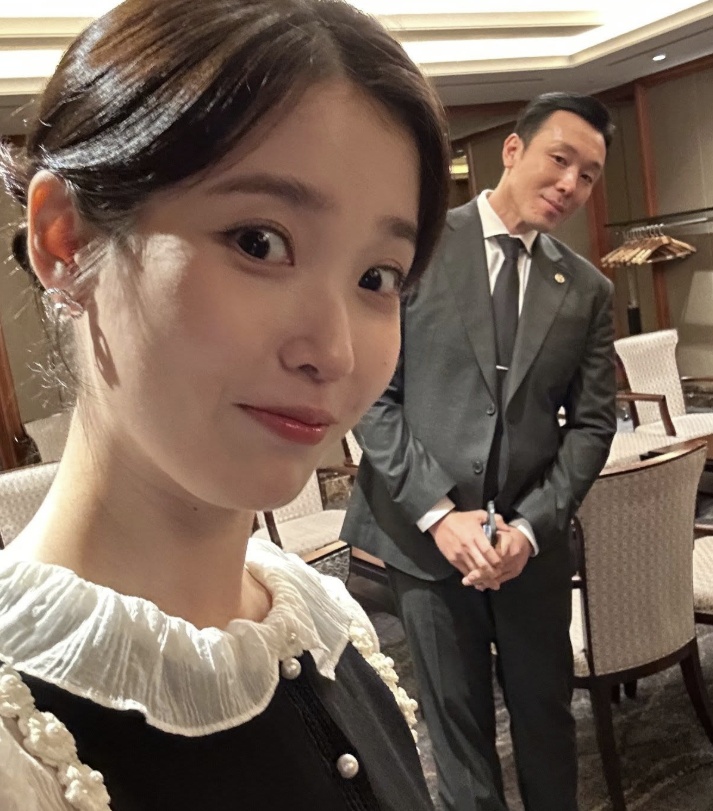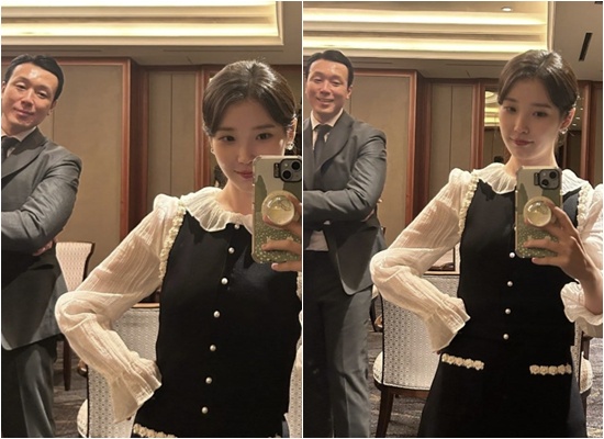 공개된 사진 속 아이유는 미소를 지은 채 거울 셀카를 남기는 모습. 박근우 씨는 아이유의 뒤에서 편안하면서도 든든한 분위기를 풍기며, 자연스럽게 '아이유 보호자'다운 면모를 과시하고 있다.