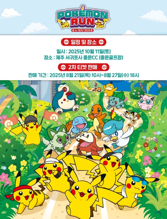 1일 ㈜포켓몬코리아(대표 임재범)는 10월 11일 제주도 서귀포시 중문골프장에서 열리는 '포켓몬 런 in JEJU 2025'의 참가 티켓이 전량 매진됐다고 밝혔다.