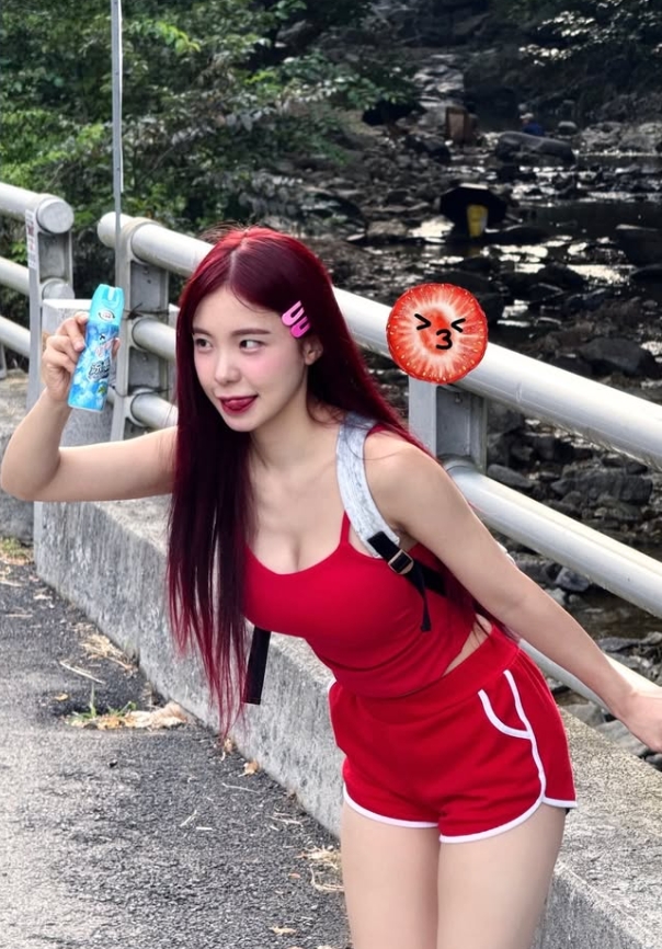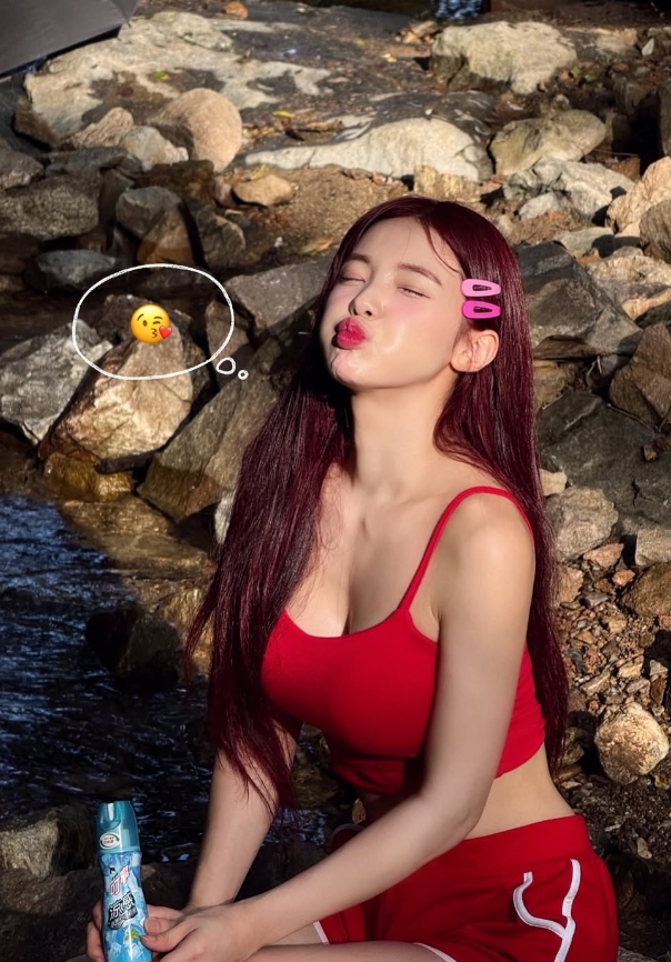 사진에는 붉은색으로 염색한 머리처럼 붉은 계열의 옷을 입은 채 계곡에서 포즈를 취한 이다혜의 모습이 담겨 있었다.