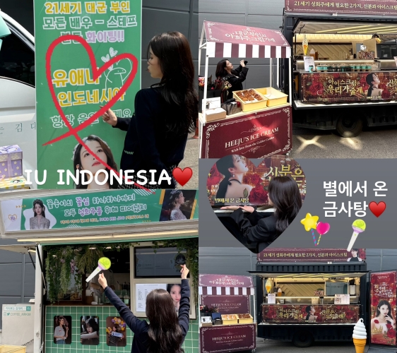 공개된 사진 속 아이유는 화려하게 꾸며진 간식 트럭 앞에서 포즈를 취하고 있으며, '대군부인의 아희주크림 가게'라는 언어유희가 눈길을 끈다.