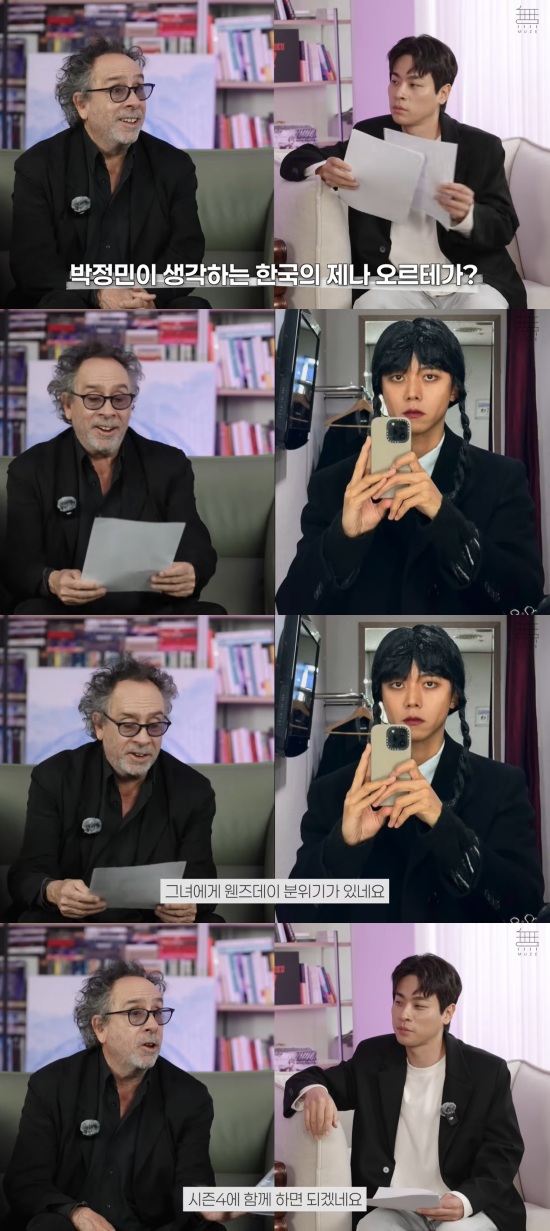 이를 들은 박정민은 "정말 동의한다"면서 "아마 제나 오르테가가 아닌 웬즈데이는 찾아볼 수 없을 거 같다는 예상이 드는데, 한국에 딱 한 명이 있다"고 말한 뒤 사진을 건넸다.