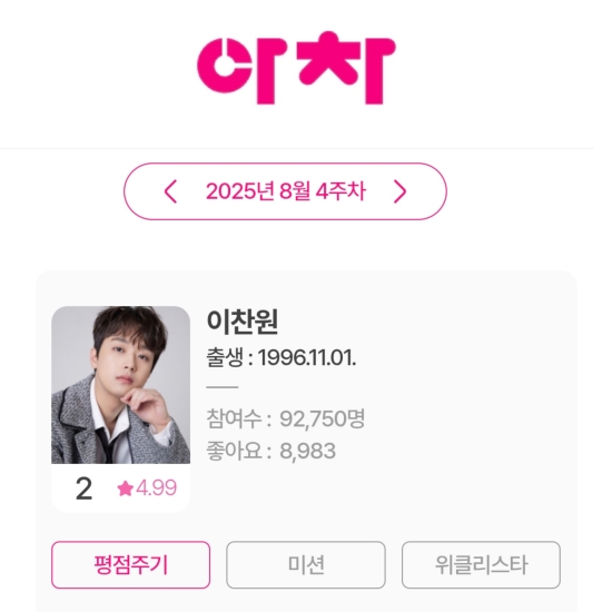 최근 아이돌차트에 따르면, 이찬원은 8월 4주 차 평점랭킹에서 2위를 기록했다.