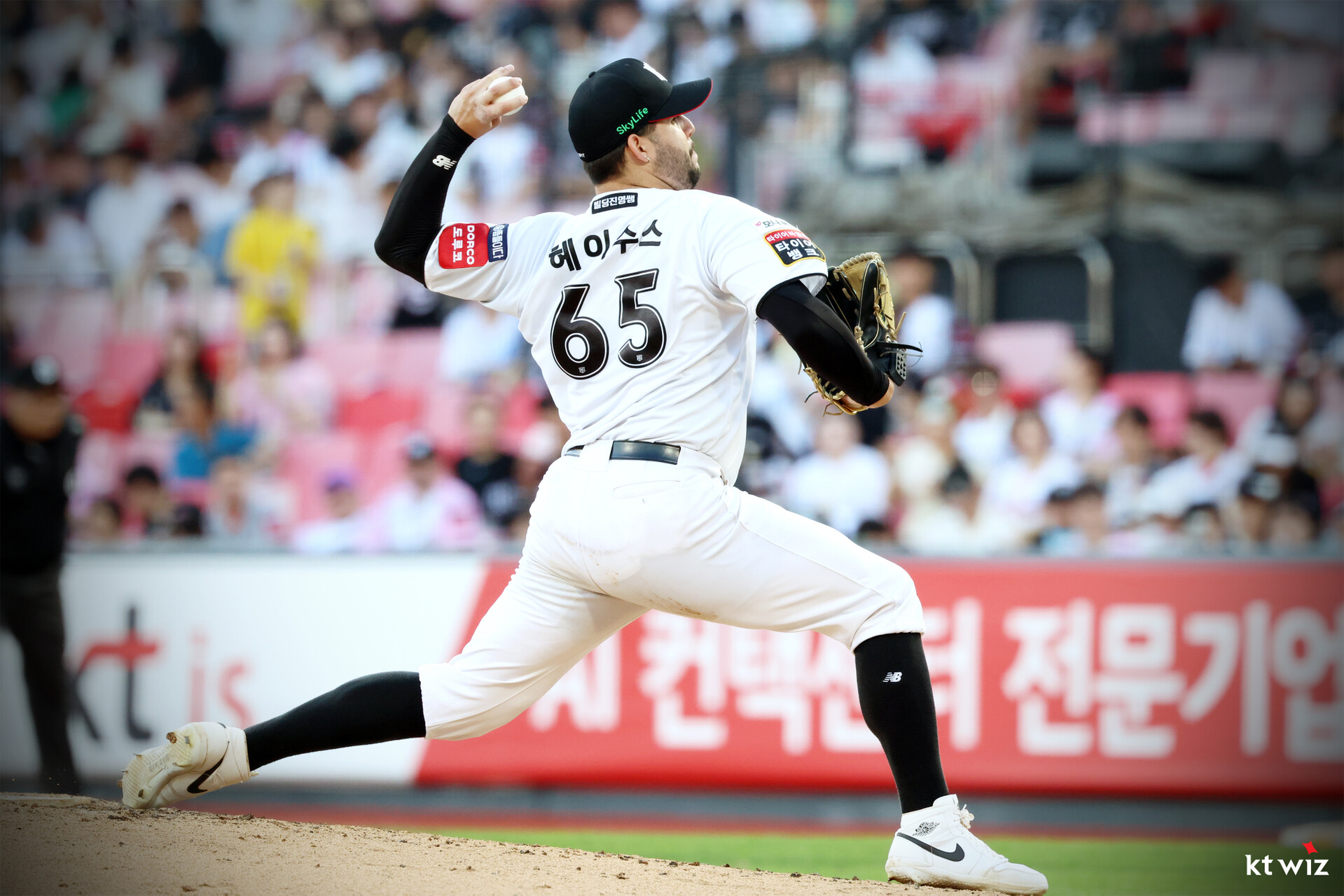 헤이수스는 3회초 고승민과 나승엽을 나란히 중견수 뜬공으로 돌려세우며 2아웃을 선점했다. 후속타자 레이예스에게 내야안타를 허용한 뒤 김민성을 헛스윙 삼진으로 잡고 이닝을 끝냈다.