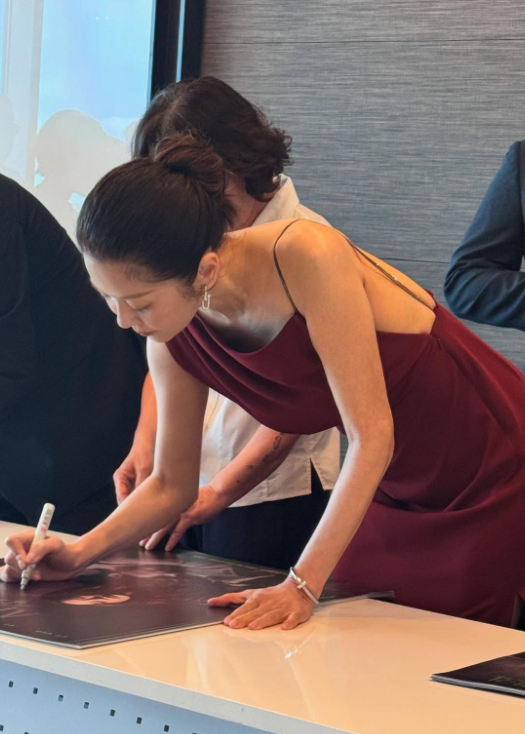이어진 사진에서는 제작발표회 당시 찍힌 고현정의 모습이 공개됐다. 사진에는 고현정이 붉은 색상의 드레스를 입고 허리를 숙여 포스터에 싸인을 하고 있는 모습이 담겼다. 사진 속 끈이 달린 드레스를 입어 훤히 드러난 어깨와 목선이 관심을 끌었다.