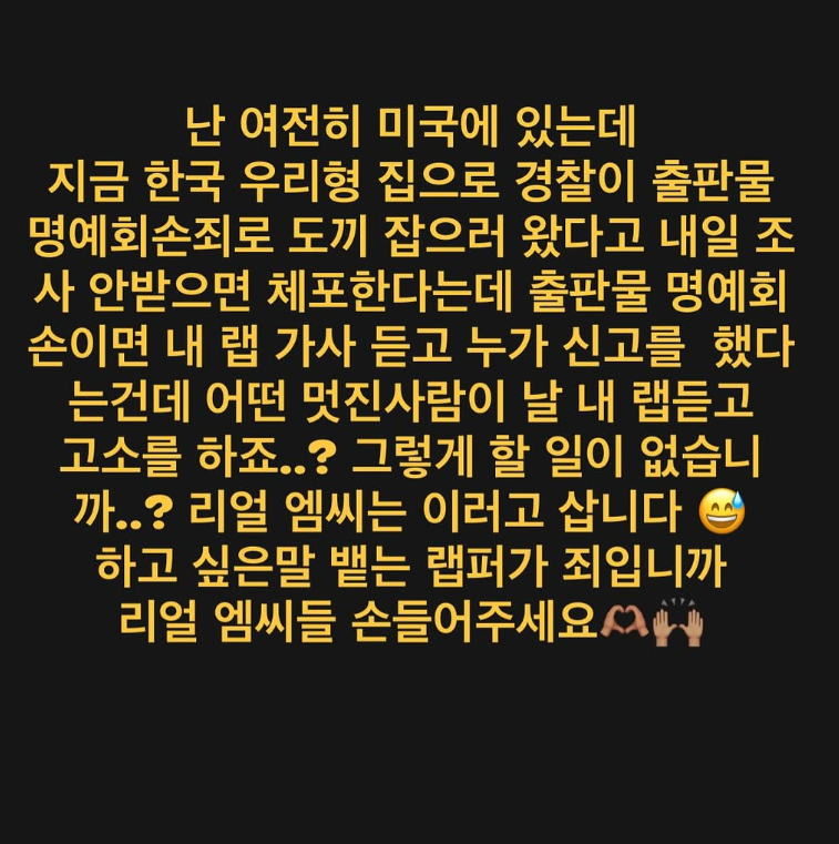 4일 도끼는 개인 계정에 "난 여전히 미국에 있는데 지금 한국 우리형 집으로 경찰이 출판물 명예훼손죄로 도끼 잡으러 왔다고 내일 조사 안 받으면 체포한다는데 출판물 명예훼손이면 내 랩 가사 듣고 누가 신고를 했다는 건데 어떤 멋진 사람이 내 랩 듣고 고소를 하죠?"라고 적었다.