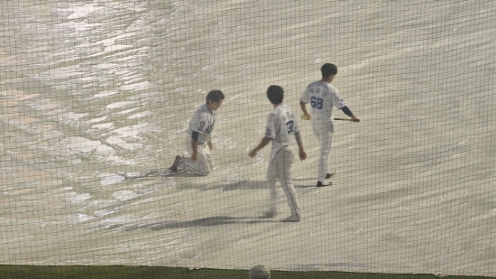 하지만 플레이볼 30여분 앞두고 대구삼성라이언즈파크에 비가 내리고 마운드와 홈플레이트에 방수포가 덮이면서 원래 예정됐던 시간 개시는 불가능했다. 결국 오후 6시50분으로 경기 시작이 20분 미뤄졌다.