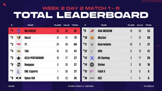 위클리 스테이지 2주 차 DAY2 경기를 모두 소화한 결과, DN 프릭스가 91점으로 1위에 올랐다.