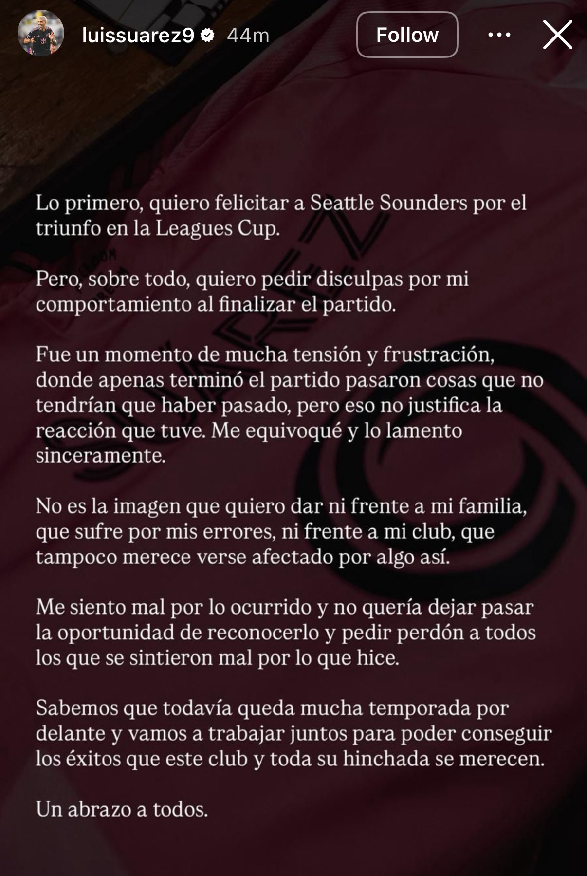 영국 공영방송 'BBC'는 5일(한국시간) "인터 마이애미의 루이스 수아레스가 시애틀 사운더스 코치진에게 저지른 부적절한 행동에 대해 사과했다"며 "그는 경기 종료 직후 큰 긴장과 좌절 속에서 나온 순간적인 행동이라고 설명했다"고 전했다.