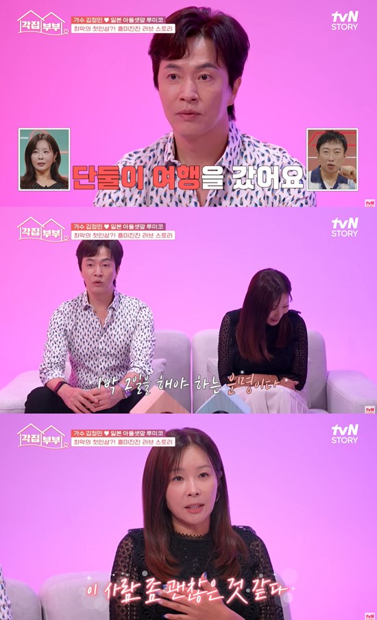 다소 파격적이며 감동적인 연애 스토리를 공개한 두 사람은 현재 각각 한국, 일본에 거주하며 각집 부부 생활을 하고 있다. 김정민과 루미코의 각집 생활은 4일 방송된 '각집부부'에서 확인해 볼 수 있다.