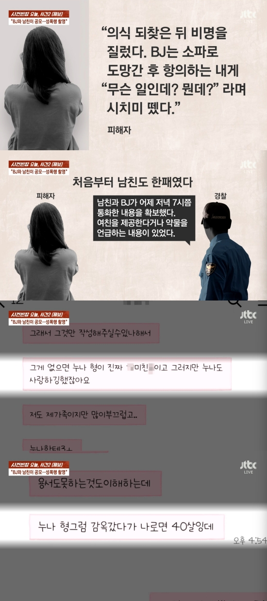피해자는 '사건반장'에 "제 기억은 위스키를 두 잔에서 네 잔 정도 밖에 안 마셨는데 방송하다가 기억이 끊겼다. 눈을 떴는데 저는 다 벗겨져 있고 BJ가 저를 강간하고 있었고 제 남자친구는 옆에 있었다. 제가 너무 놀라서 소리를 지르니까 BJ는 빠르게 밑 층으로 내려가고 동시에 동영상 카메라가 꺼지는 소리가 들렸다. 제가 밑으로 내려가서 뭐 하는 짓이냐고 하는데 아무렇지 않게 소파에서 이불을 덮고 '무슨 일이야? 뭐가?'라고 했다"고 밝히며 "성범죄가 라이브로 방송됐을 것 같아 공포스럽다"고 털어놨다.