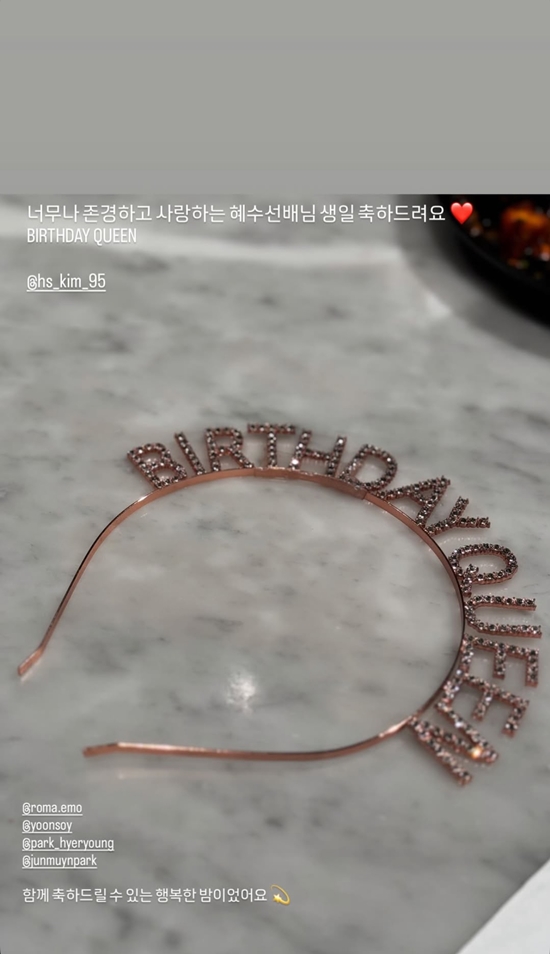 공개된 사진에는 'BIRTHDAY QUEEN'이라는 글자 장식이 인상적인 머리띠가 담겨있다. 특히 반짝이는 효과를 위해 큐빅으로 장식된 듯 정성이 가득 담겨 보여 준비한 사람들의 애정이 엿보인다.