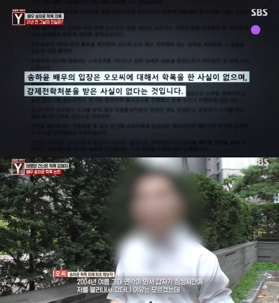 이 가운데 송하윤 측 법률대리인은 학교폭력 가해 의혹과 관련해 '궁금한 이야기 Y' 방송 전날 제작진에게 공식 입장을 밝혀왔다. 학폭 피해 제보자 오모 씨에 대한 학교폭력은 사실이 아니며, 강제전학 처분을 받은 사실이 없다는 것.