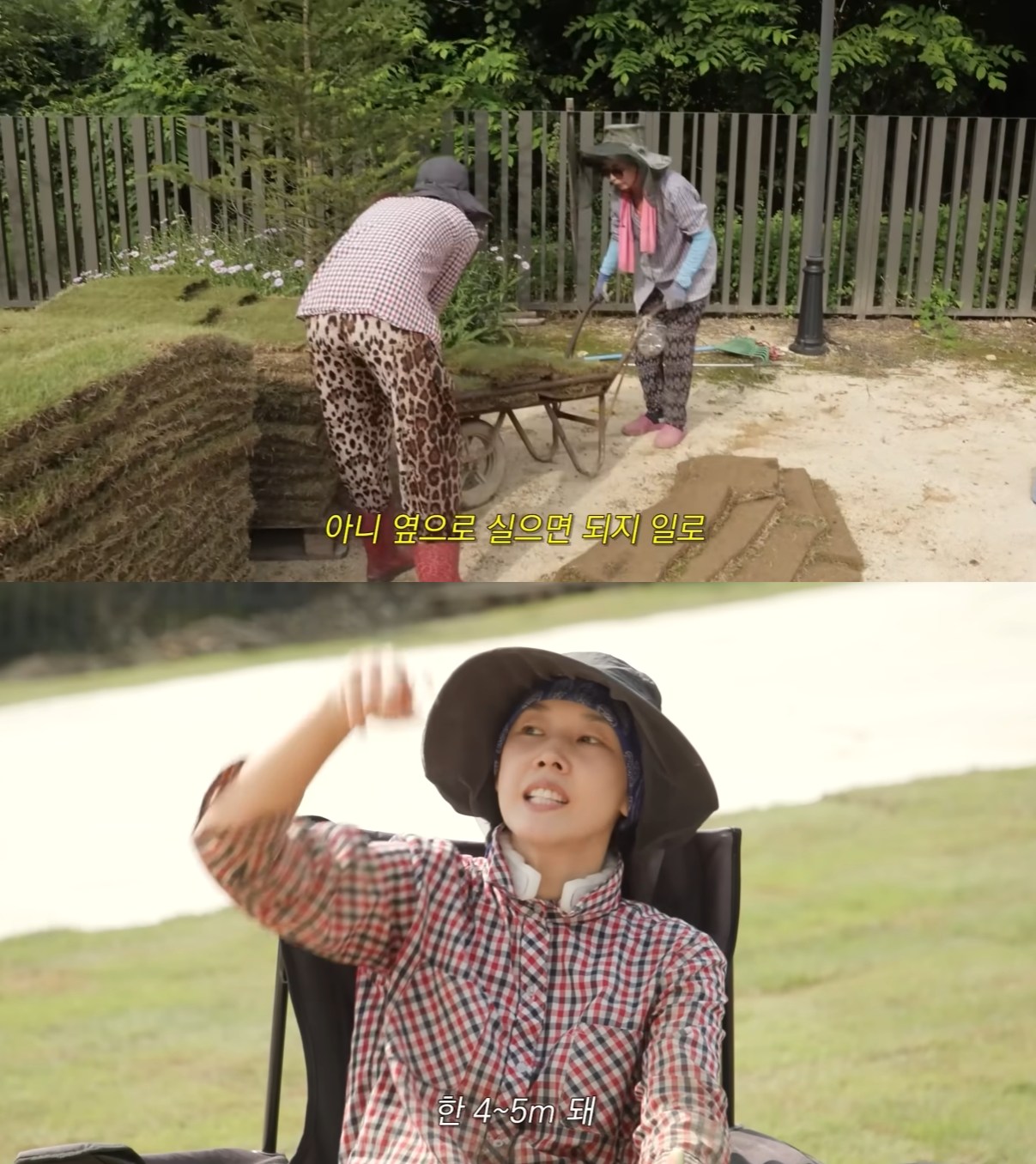 공개된 사진에서 한혜진은 챙 넓은 모자와 몸빼 바지를 입은 작업복 차림으로 잔디 깔기에 열중하고 있다.