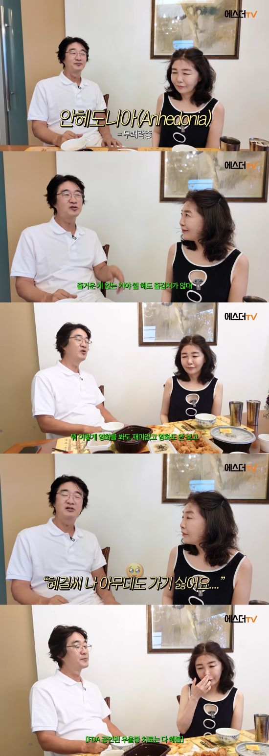 이어 "의학용어로 안헤도니아(Anhedonia)라는게 있다. 무쾌락증이다. 여에스더가 즐거운 게 없다. 뭘 해도 즐겁지가 않다더라. 영화를 봐도 재미없고 맛있는 것도 재미없고 여행도 재미없고 쇼핑도 재미없어 한다"라고 여에스더가 겪는 무쾌락증에 대해 토로했다.