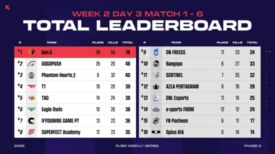 위클리 스테이지 2주 차 DAY3 경기를 모두 소화한 결과, 젠지가 78점으로 1위에 올랐다.
