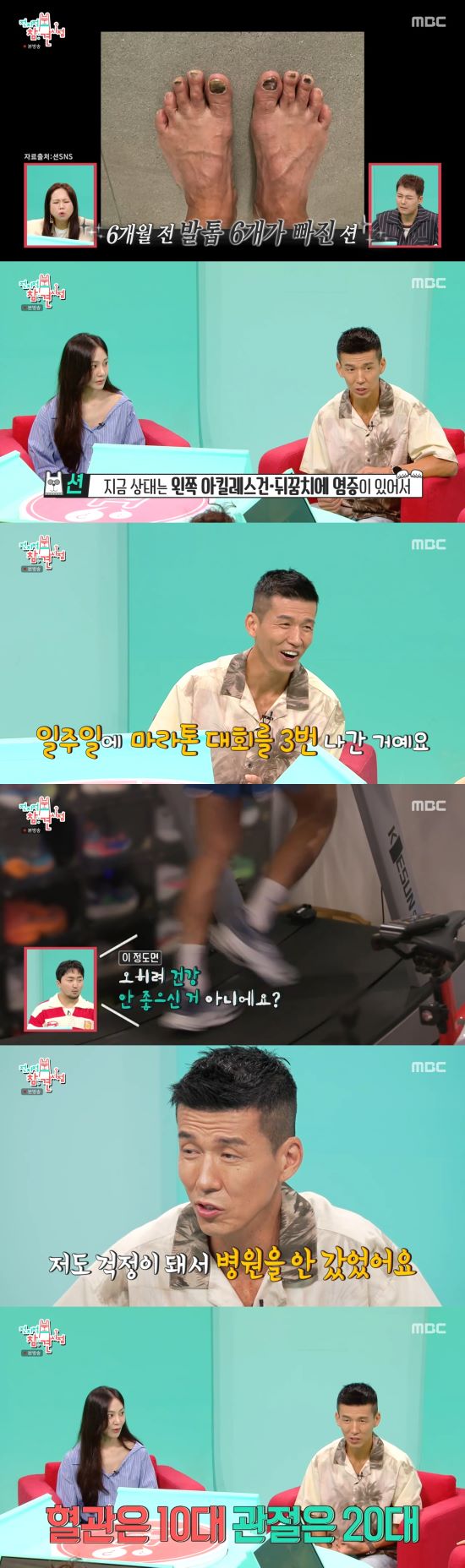 또 션은 너무 달리기를 많이 해 6개월 전 발톱이 6개나 빠졌다고 전했다. 션은 "너무 많이 뛰면 저렇게 된다. 지금은 발톱 6개가 들린 상태다. 왼쪽 아킬렌스건, 뒤꿈치에 염증이 있어 걸을 때마다 아프다. 다른 데가 조금 더 아프면 그걸 잊는다"라고 고백해 놀라움을 자아냈다.