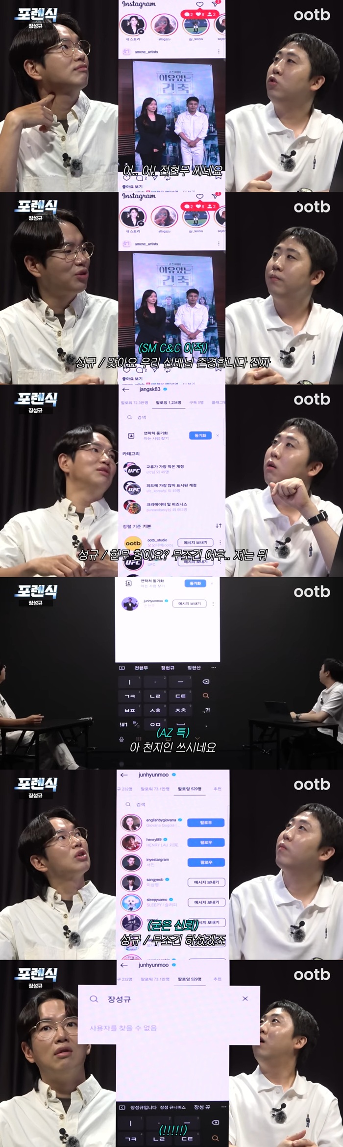 하지만 전현무의 팔로우 목록에는 장성규가 존재하지 않았다. 검색되지 않는 자신의 이름에 "어?"라며 충격을 받은 장성규의 표정이 웃음을 자아낸다.