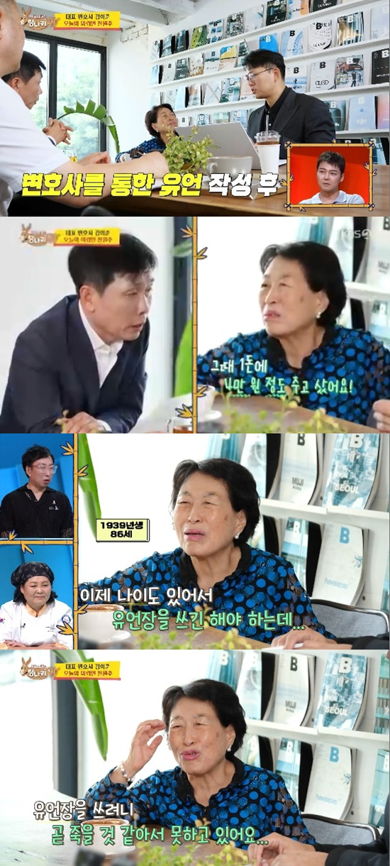 전원주는 나이가 있어서 유언장을 쓰기는 해야할 것 같다면서 "유언장을 쓰면 죽을 것 같아서 못하고 있다"고 망설였다.