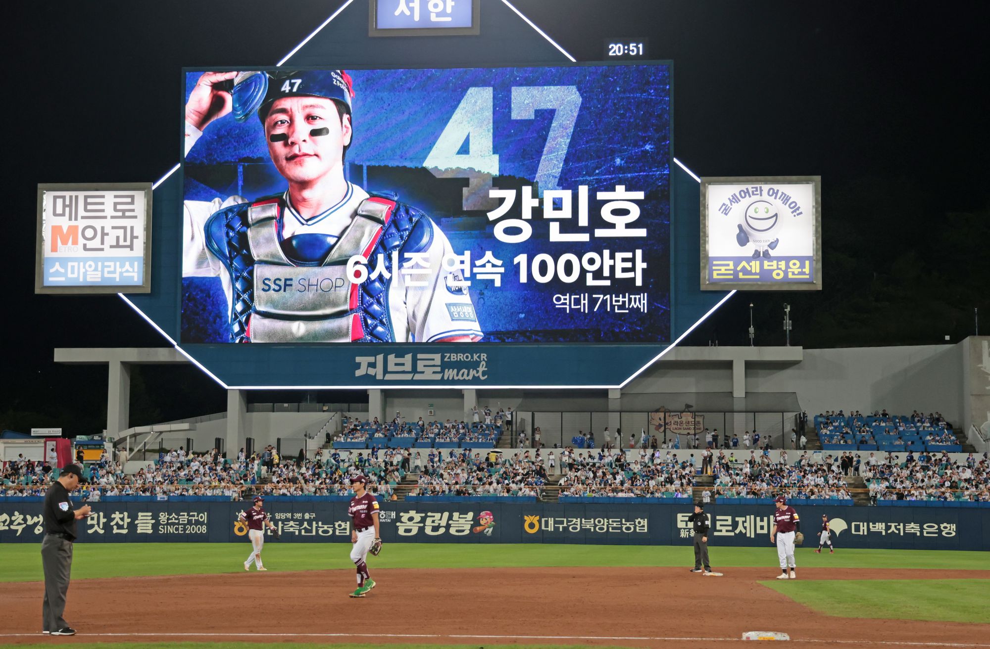 강민호는 지난 5일 홈 키움 히어로즈전에서 KBO리그 역대 71번째 6시즌 연속 100안타 기록을 달성하기도 했다.
