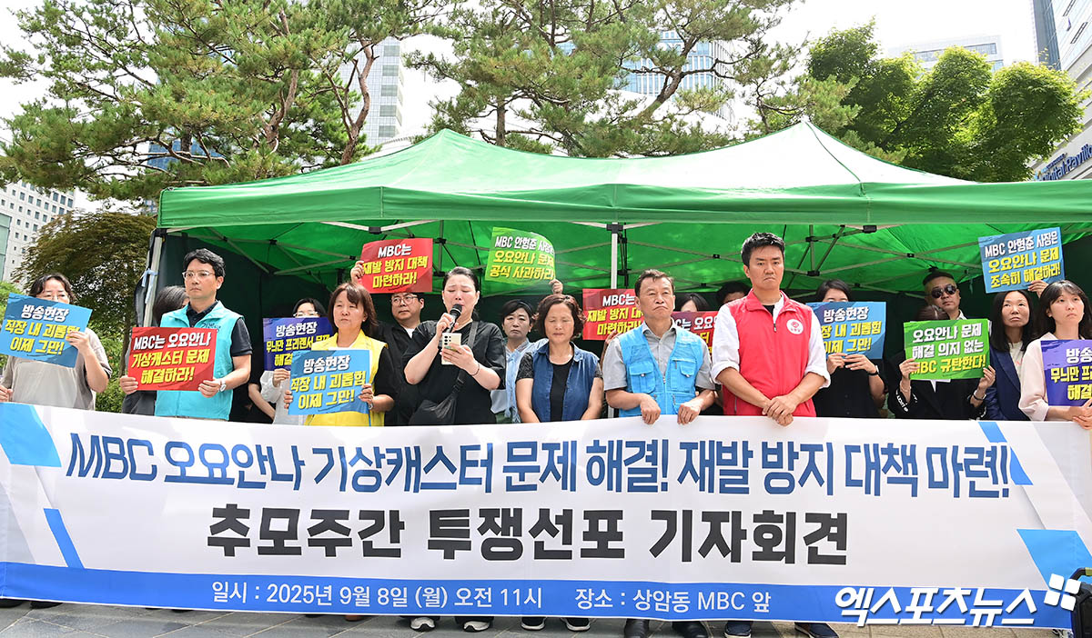 (엑스포츠뉴스 박지영 기자) 8일 오전 서울 상암동 MBC 문화방송 사옥 앞에서 故 오요안나 MBC 전 기상캐스터 추모 주간 투쟁 선포 기자회견이 진행됐다.