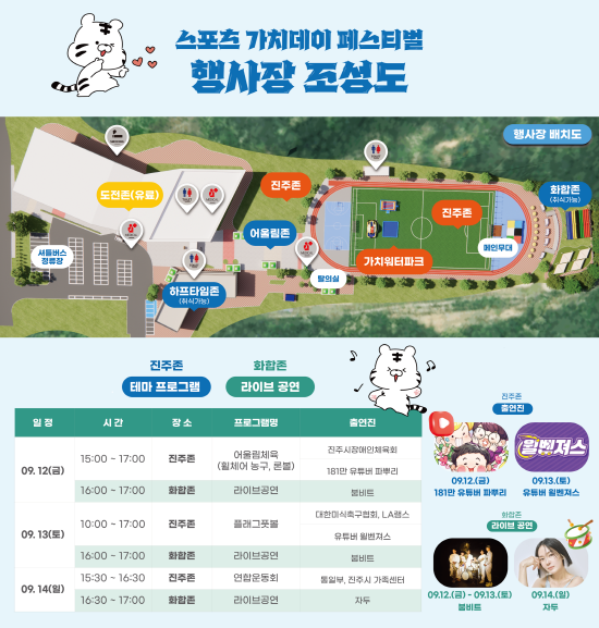 아울러, 양궁·인공암벽·가치 워터파크 등의 상시 운영 콘텐츠를 체험할 수 있으며, 가수 '자두', 브라스밴드 '붐비트'의 공연도 마련돼 있어 스포츠와 문화를 아우르는 풍성한 볼거리를 제공할 예정이다.