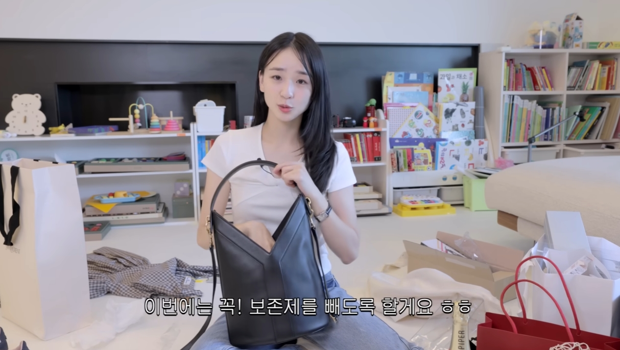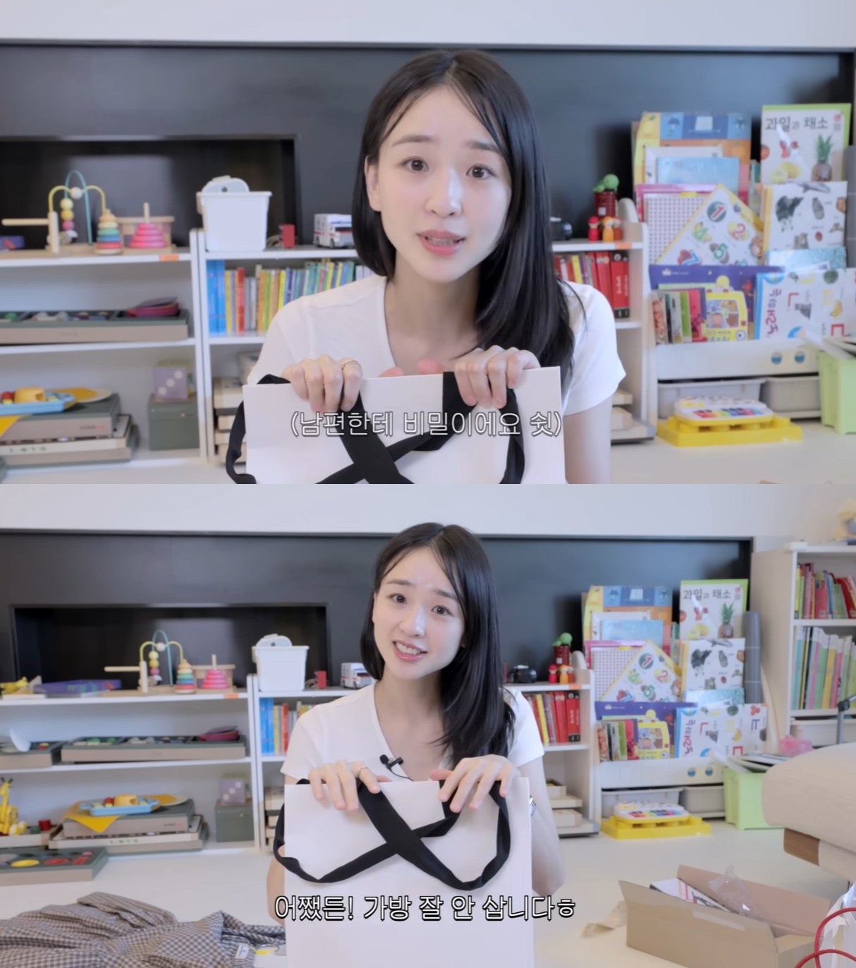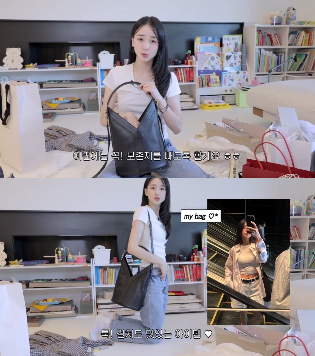가방을 구입한 이유에 대해서는 "제가 블랙 기본 가방이 꼭 필요했는데, 아기를 키우다 보니 빅 백들밖에 없더라. 스타일이 너무 비슷해져서, 조금 다른 스타일로 한 번 사 봤다"고 설명했다.