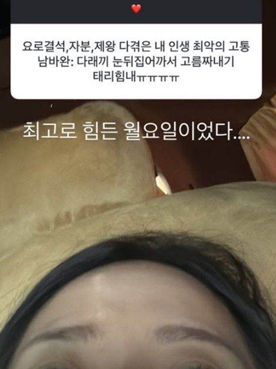 8일 최선정은 "요로결석, 자분(자연분만), 제왕(절개) 다 겪은 내 인생 최악의 고통 넘버원. 다래끼 눈 뒤집어서 고름 짜내기. 태리 힘내"라는 글과 함께 사진을 게재했다.