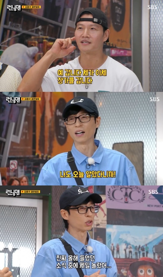 김종국과 오랜 인연을 이어오고 있는 유재석도 "나도 오늘 알았다. 진짜 올해 들었던 소식 중에 제일 놀랐다"며 연신 놀란 가슴을 쓸어내렸다.