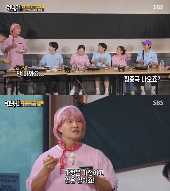 부대찌개 식당을 찾아 식사를 하며 촬영을 이어가던 중 유재석은 "'미우새'에서 가구 보러 가고 이런 것 찍냐"고 넉살을 부렸고, 김종국은 "안 찍는다. 안한다"고 선을 그었다.