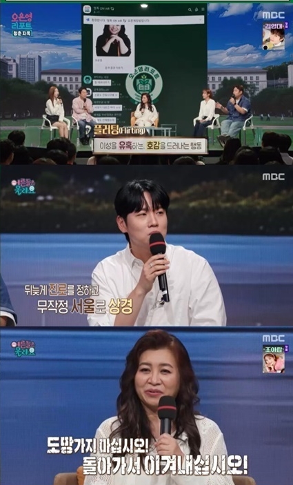 첫 번째 주제는 20대들의 뜨거운 관심사인 '연애'였다. "썸의 기준이 뭐냐"라는 질문 하나로 현장은 곧장 열기로 가득 찼다. 문세윤은 "둘이 밥 먹으면 썸"이라고, 소유진은 "밥과 영화 두 개를 동시에 같이 하면 썸"이라고 전했다.