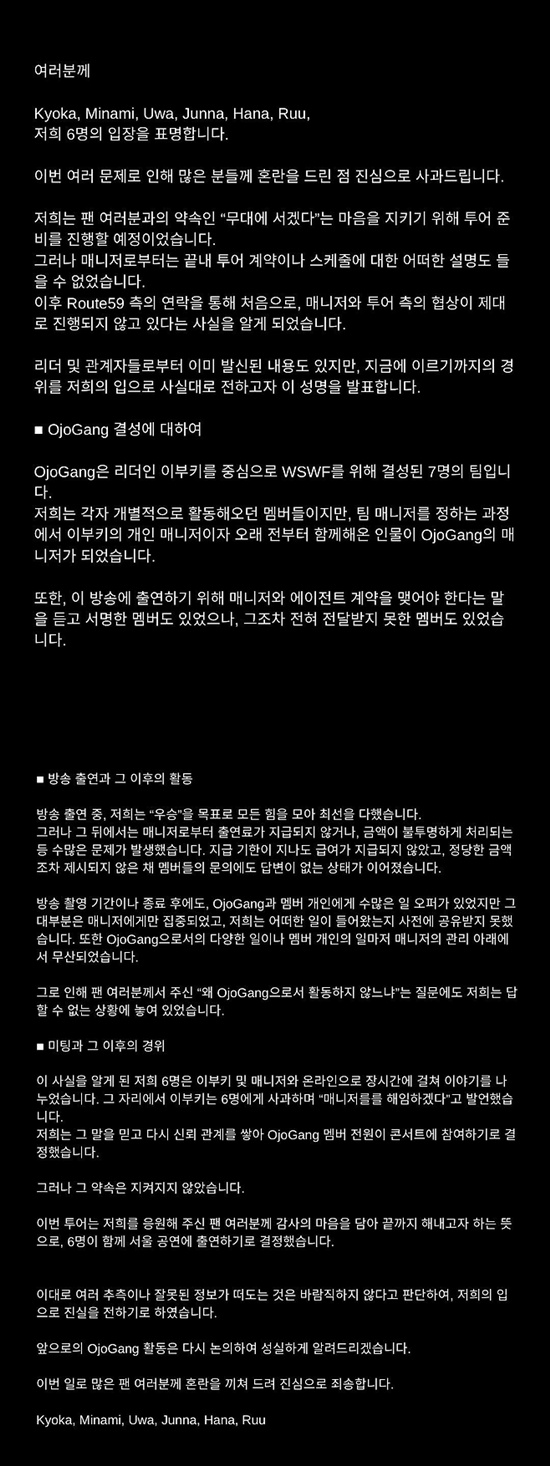(엑스포츠뉴스 조혜진 기자) '스우파3' 우승 크루 오사카 오죠 갱과 리더 이부키의 갈등이 수면 위로 떠오른 가운데, 오죠갱 멤버 6인이 입장을 밝혔다.