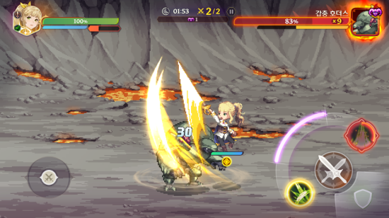 전투는 자동이 아닌 수동 조작을 기반으로 한다. 적 공격 직전 타이밍에 맞춰 ‘쳐내기’에 성공하면 게이지가 차고, 이를 활용해 ‘링크 시스템’을 발동하거나 보스를 무력화하는 ‘브레이크’로 이어진다. 픽셀 아트 특유의 명확한 피드백 덕분에 공격, 회피, 쳐내기 액션이 더욱 선명하게 전달된다. 개발진은 “픽셀의 단순함이 오히려 액션의 개성을 부각시킨다”고 강조했다.