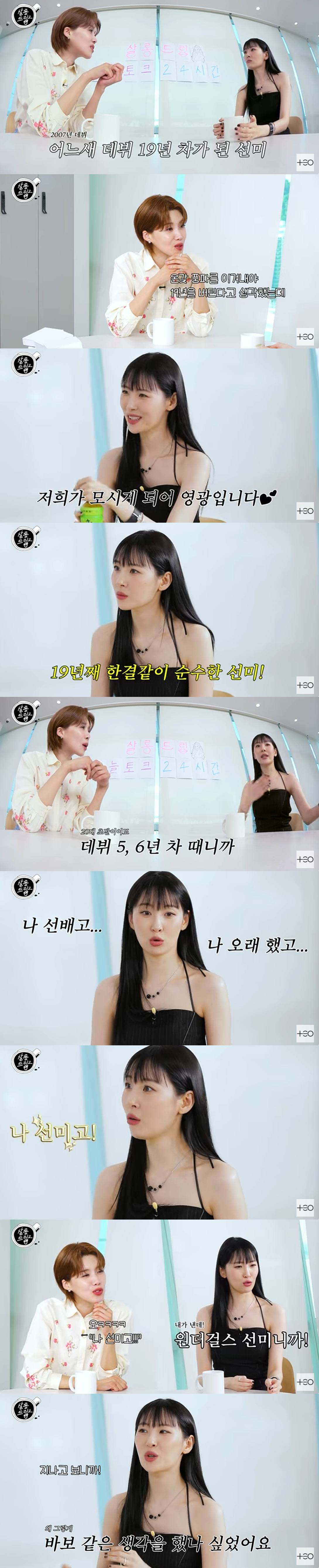 선미는 이에 "근데 저도 고민이 많았다 저도 찌들었던 적이 있다. 20대 초중반이었던 것 같다. 다들 연예인 병이라고 하지 않나. 그 당시에 5,6년 차 있었을 때니까 나 선배고 오래 했고, 나 선미고. 왜냐면 원더걸스 선미니까"라며 철없던 생각을 했던 적 있다고 솔직하게 털어놨다.