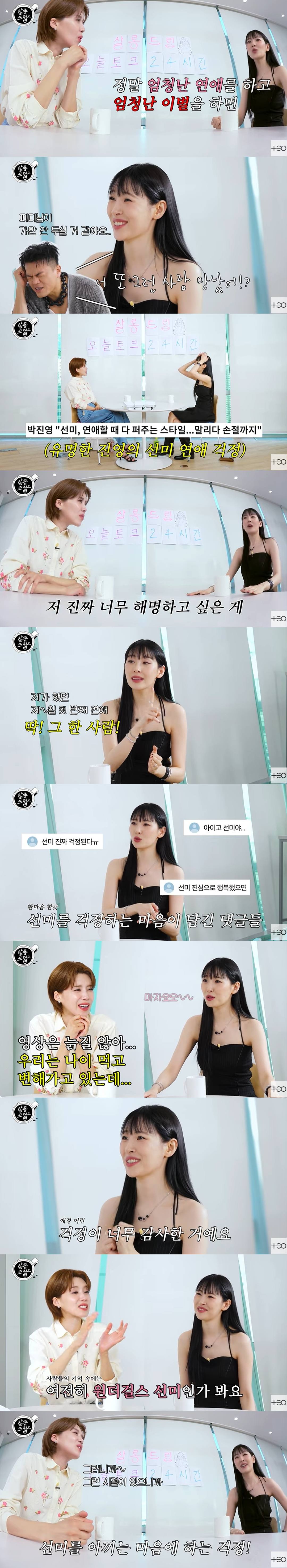 선미는 "'너 또 그런 사람 만났어!'라고 하면서"라고 설명해 웃음을 자아냈다. 선미 연애를 향한 박진영의 걱정은 유명하다.