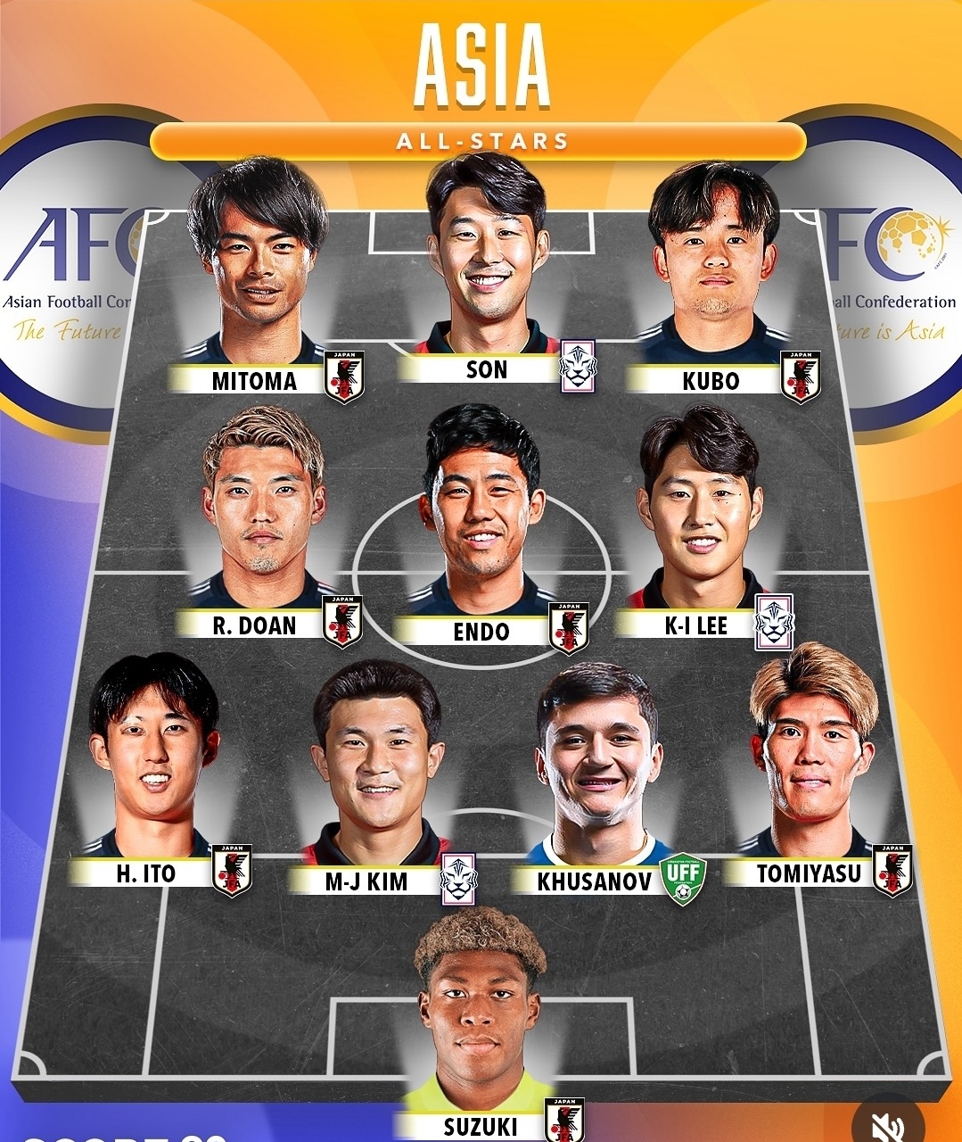 잉글리시 프리미어리그에서 '리빙 레전드' 공격수로 활약하다가 지금은 미국 LAFC에서 뛰고 있는 손흥민이 최전방 스리톱 중에 한 명으로 포함됐으며, 프랑스 최고 명문이자 유럽축구연맹(UEFA) 챔피언스리그 현재 챔피언인 파리 생제르맹(PSG)의 미드필더 이강인도 중원에 포진했다.