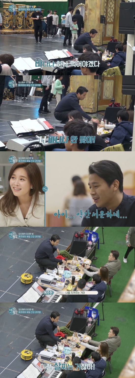 손준호가 "바나나 하나 먹어야겠다"고 하자 옥주현은 "너 바나나 안 맞아"라고 제지했다. 손준호가 "아이 약간 서운하네"라고 허탈한 웃음을 보이자 "너를 지켜주는 거야. 대신 이거 먹어. 이건 맞아"라고 말했다.