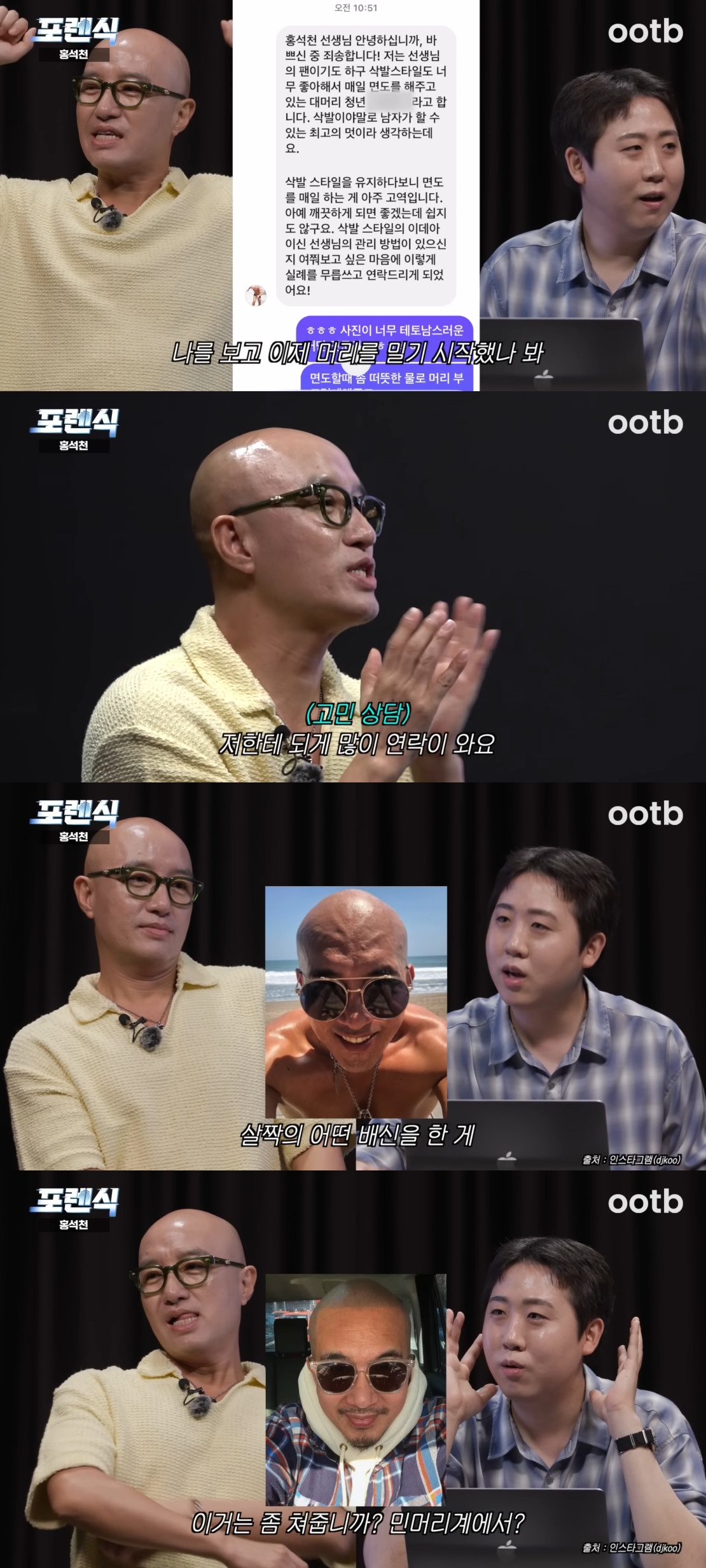 홍석천은 자신의 SNS 계정에 온 DM(다이렉트 메시지)를 공개했다. 그는 어제 자신에게 민머리 관리법에 대해 질문한 청년을 언급하며 "난 이런 친구들이 되게 재밋다. 자기가 대머리 청년이라고 날 보고 머리를 밀기 시작했나보더라. 머리 미는 방법, 깔끔하게 미는 제품을 물어본다"고 설명했다.