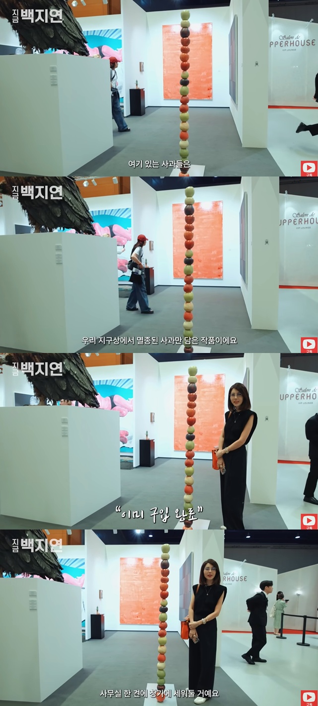 안드레아 갈바니의 사과 조형물 앞에 선 백지연은 "이 작품이 오래 전부터 눈에 들어왔다. 여기 있는 사과들은 우리 지구상에서 멸종된 사과만 담은 작품"이라며 "우리 인간들의 잘못에 의해서 망가지고, 사라진 종에 의한 경각심을 이야기한다. 또 우리에게 시사점을 주기도 한다"며 해당 작품을 구매했다고 밝혔다.