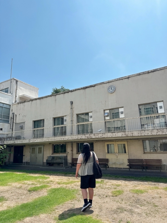 또 다른 사진에는 마치 교도소를 연상시키는 낡은 페학교 건물 앞에서 포즈를 취하고 있는 이국주의 모습이 담겼다.