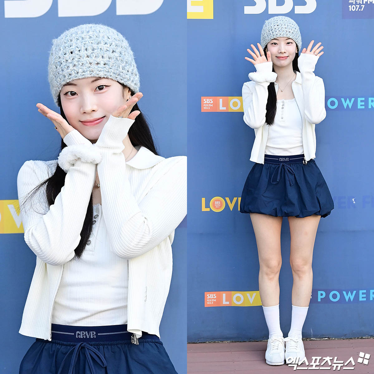 다현은 화이트 톤의 상의에 네이비 컬러의 벌룬 미니 스커트를 매치해 귀여움을 더했다. 짧은 기장 아래로 늘씬한 각선미가 돋보였다.