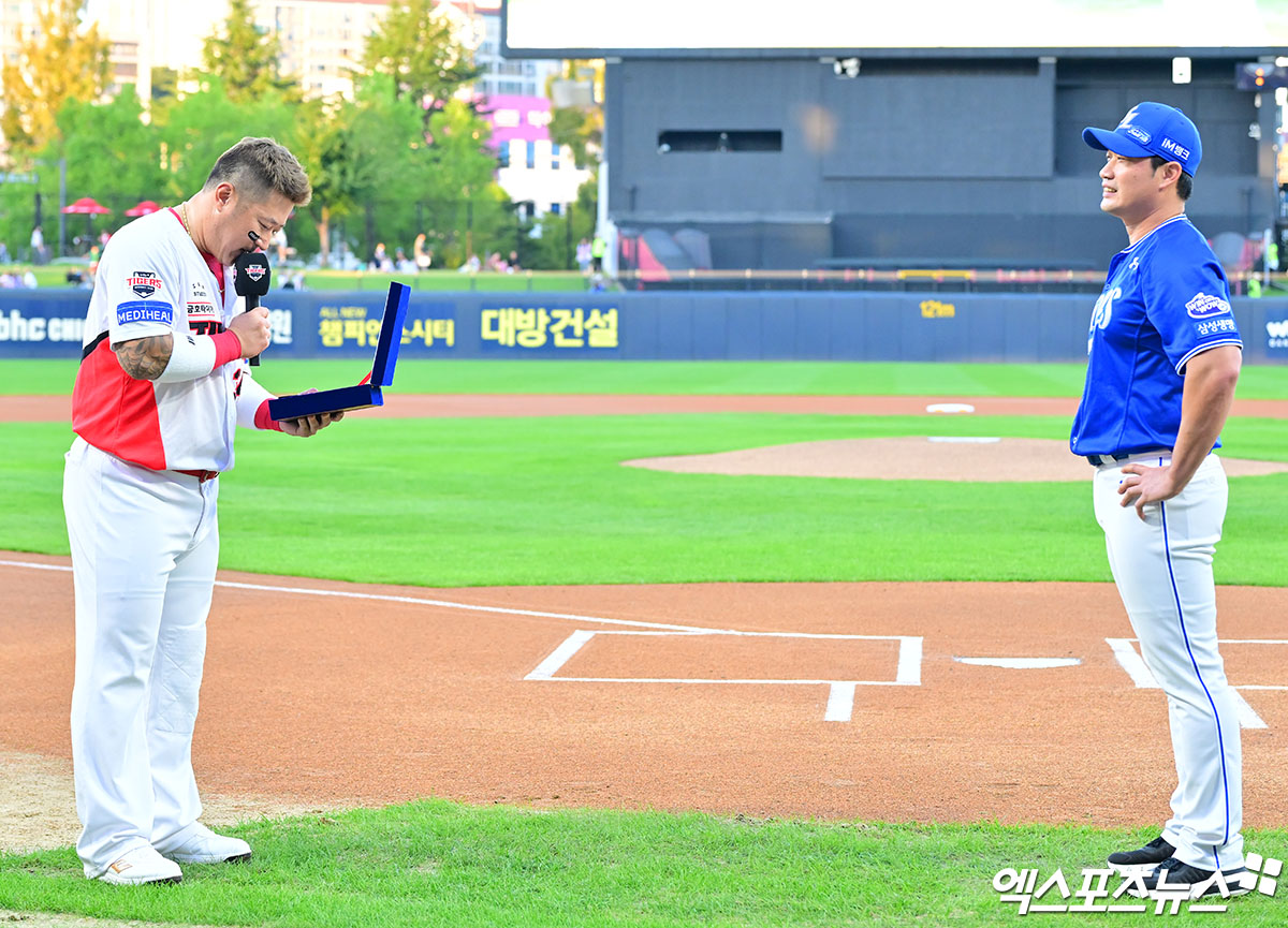 이날 행사에서 KIA 최형우가 삼성 오승환에게 감사패를 전달하고 있다.