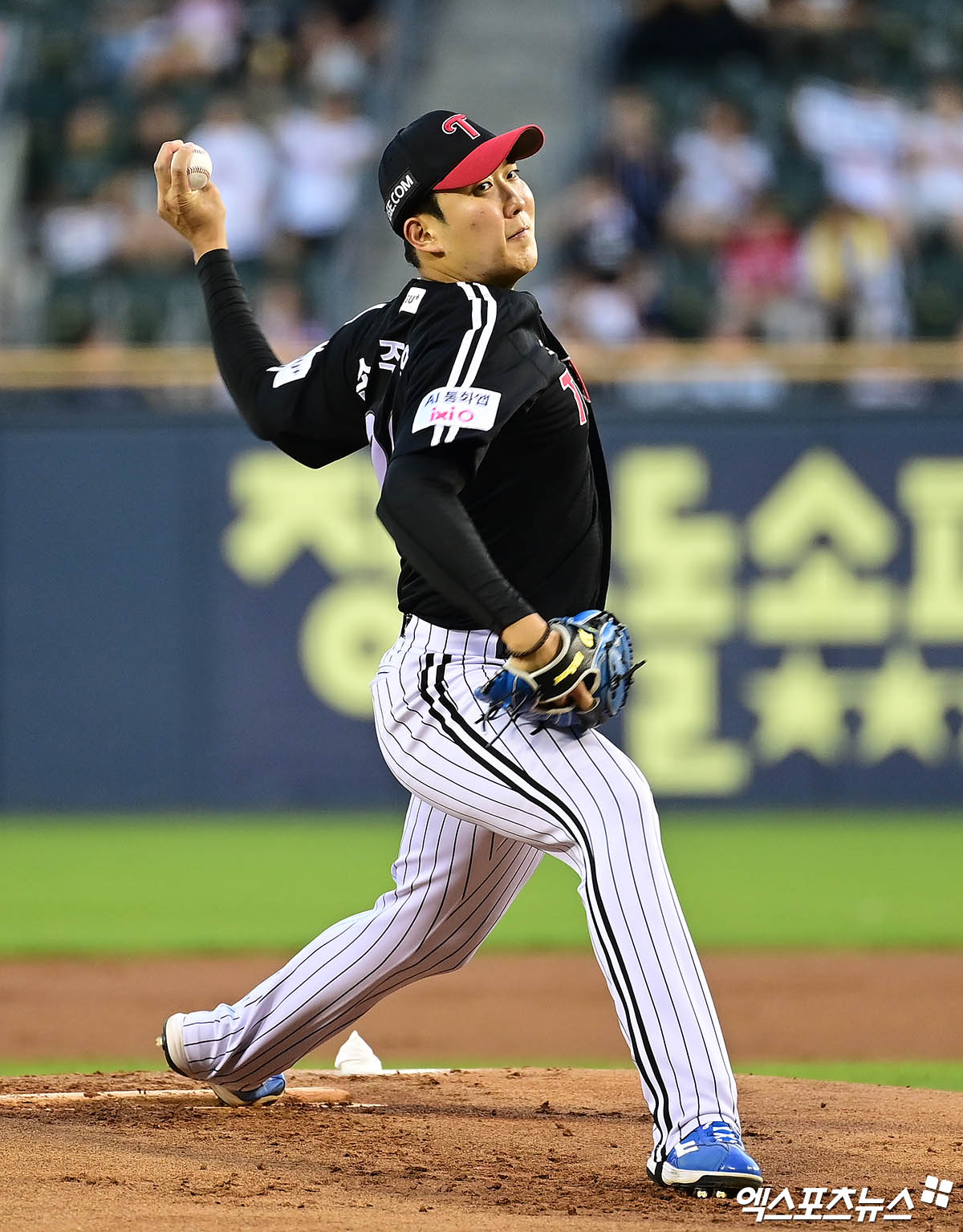 (엑스포츠뉴스 잠실, 박지영 기자) 10일 오후 서울 송파구 잠실야구장에서 열린 '2025 신한 SOL Bank KBO리그' LG 트윈스와 두산 베어스의 경기, 1회말 LG 선발투수 손주영이 역투하고 있다.