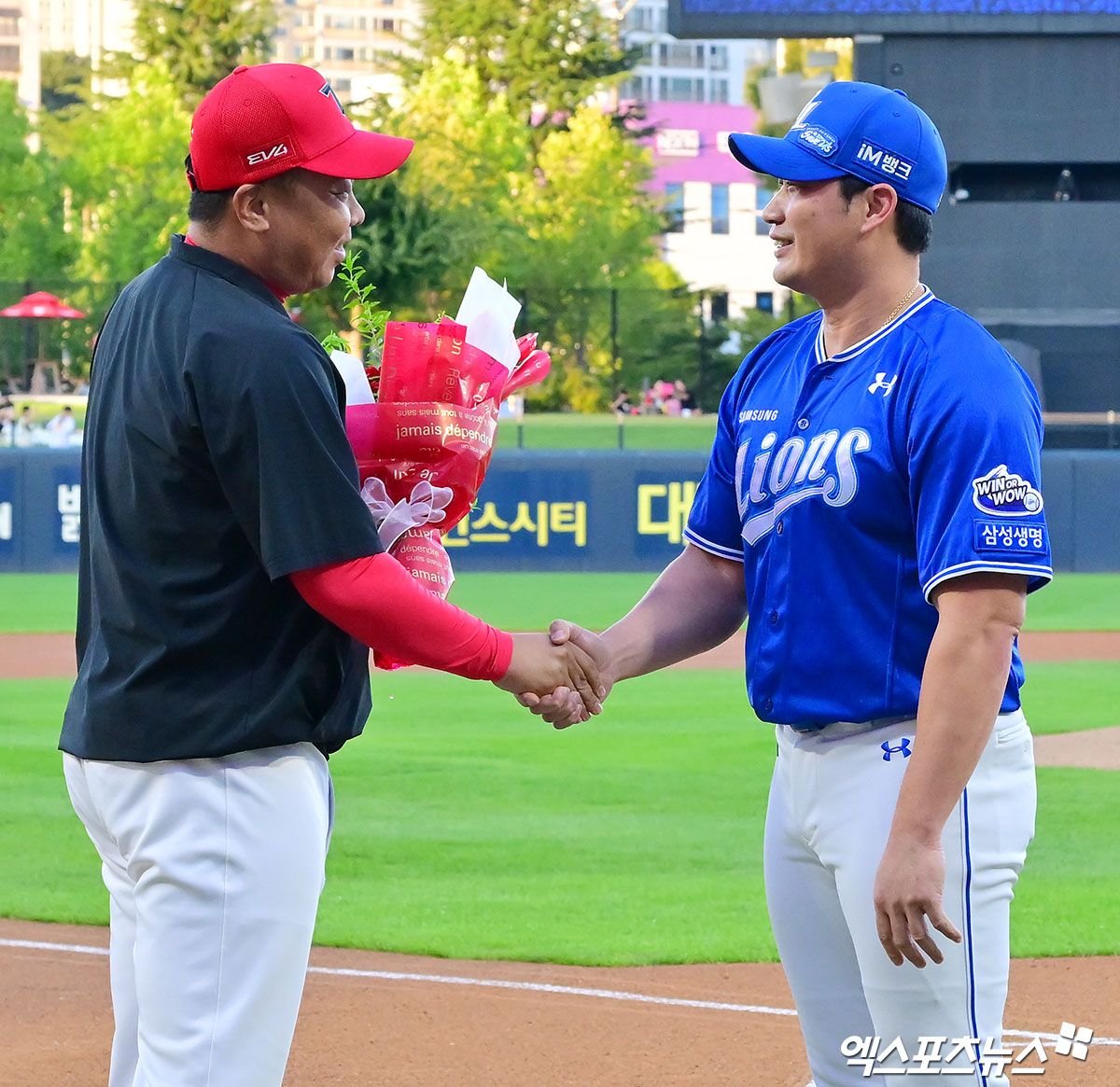 이날 행사에서 KIA 이범호 감독이 삼성 오승환에게 꽃다발을 전하고 있다.
